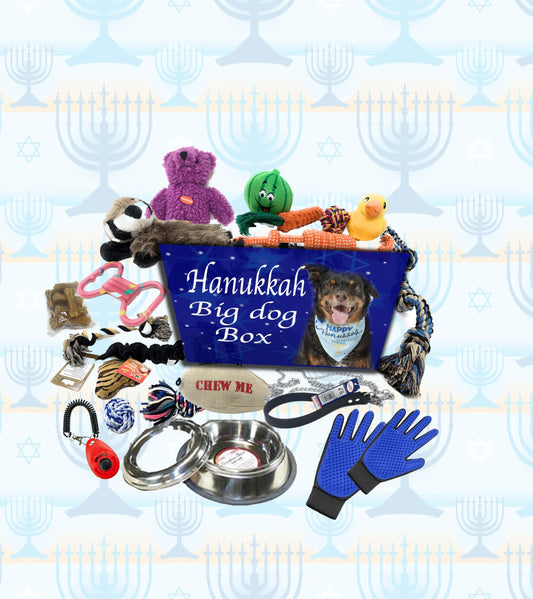 Hanukkah Dog Gift Set Dog Toys Gift Basket Includes a Large 32 oz. Water Bowl, Grooming-Bath Gloves, a Treat, 2 Plush Toys, Chew Tennis Ball, a Latex Toy, Squeaky Plush Bear 15 Piece Gift Basket