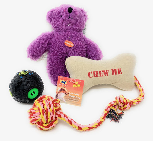 Sparky Pet Co Christmas Large Dog Gift Set, 5 Pieces: Toy, Bowl, Grooming Gloves, 12" Rawhide Retreiver Dog Chew Bones