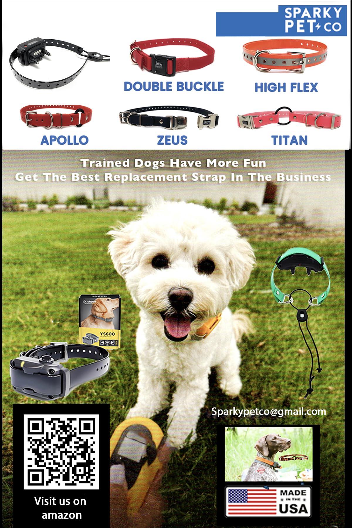 - SPARKY PET CO: Our mission is to create the best customer experience with the products, service, and after-sale support you can count on. We offer a wide range of popular pet supplies and manufacture our exclusive replacement straps for all electronic dog training and invisible fence systems, proudly made in the USA. Get the best from Sparky Pet Co!